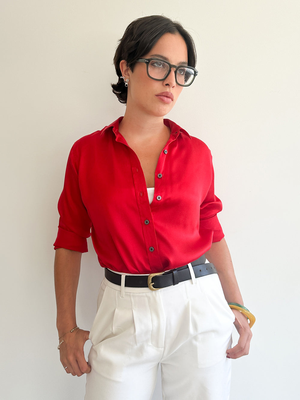 Cut from fluid satin crepe silk in a loose silhouette this luscious classic style shirt will bring an airiness to corporate dressing and charme to casual-wear.  The Cherry Red tone makes it easy to match to anything in your wardrobe.