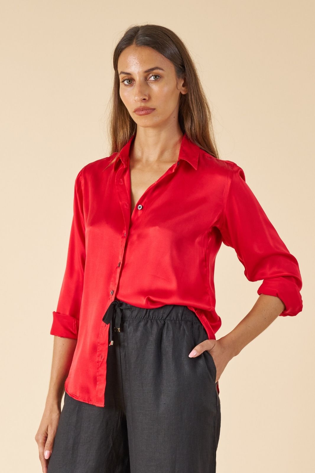 Cut from fluid satin crepe silk in a loose silhouette this luscious classic style shirt will bring an airiness to corporate dressing and charme to casual-wear.  The Cherry Red tone makes it easy to match to anything in your wardrobe.