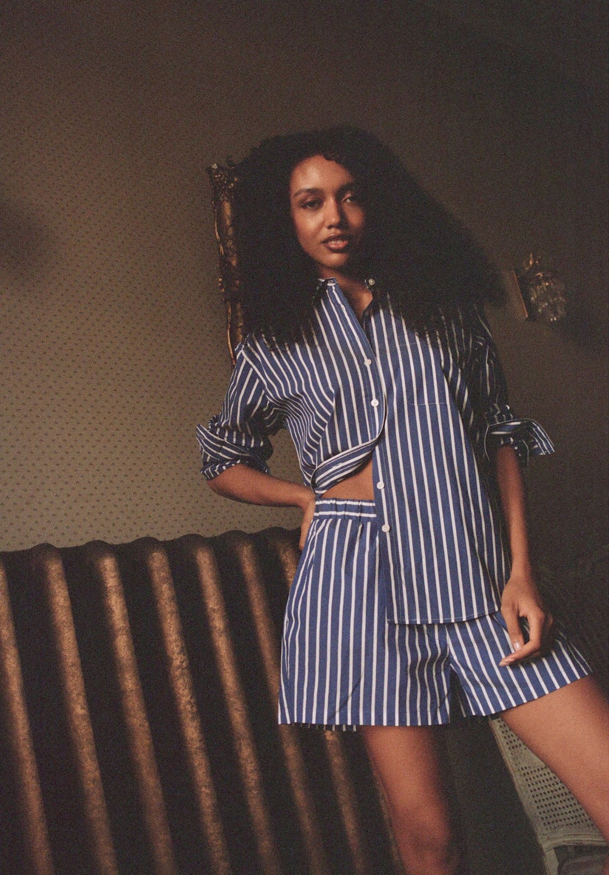 Meet your new summer favourite: the Shoshana Blue Stripes Shorts — women’s striped shorts designed for effortless style and all-day comfort. Perfect for warm weather, they’re crafted from a softly structured cotton blend that combines natural breathability with modern performance.